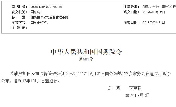為了規范融資擔保公司的行為,防范風險,2017年8月2日,國務院總理李克強簽署國務院令683號,公布《融資擔保公司監督管理條例》(以下簡稱條例),自2017年10月1日起施行。