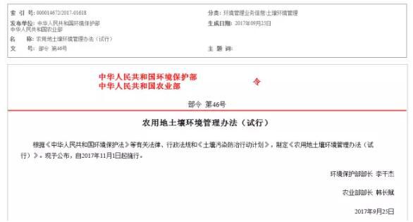 將于11月1日起施行的《農用地土壤環境管理辦法(試行)》規定,禁止在農用地排放、傾倒、使用污泥、清淤底泥、尾礦(渣)等可能造成對土壤污染的固體廢物。
