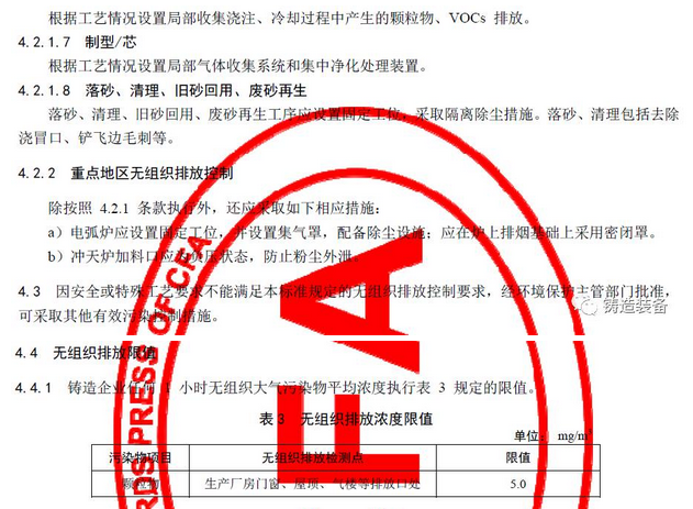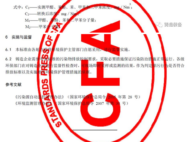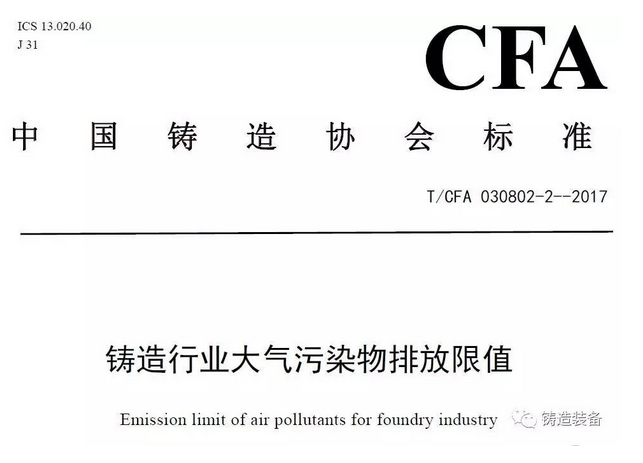 2017年7月31日,由中國鑄造協(xié)會發(fā)布的T/CFA030802-2—2017《鑄造行業(yè)大氣污染物排放限值》(中國鑄造協(xié)會標準公告 2017年 第06號)發(fā)布。該標準于2017年10月1日起實施。