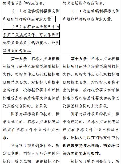 在對招標法第19條的修改中,在保留原有“國家對招標項目的技術、標準有規定的,招標人應當按照其規定在招標文件中提出相應要求”內容的基礎上,增加了“招標人可以在招標文件中合理設置支持技術創新、節能環保等方面的要求和條件”的內容,加重了創新和節能環保在招投標中的考量力度。
