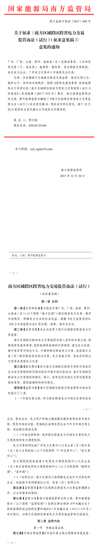 近日,國家能源局南方監(jiān)管局日前發(fā)布了《關(guān)于征求南方區(qū)域跨區(qū)跨省電力交易監(jiān)管辦法(試行)(征求意見稿)意見的通知》,辦法適用于南方區(qū)域(廣東、廣西、海南、云南、貴州)跨區(qū)跨省電力交易監(jiān)管。在征求意見期間,有意見可以反饋到國家能源局南方監(jiān)管局,截止日期為12月29日。