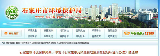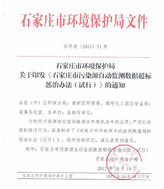 近日河北石家莊市環保局印發《石家莊市污染源自動監測數據超標懲治辦法(試行)》(以下簡稱“辦法”)。辦法明確,企業污染源自動監測數據出現超標將被處罰,超標4次及以上,將停產整治。辦法自11月1日起施行。