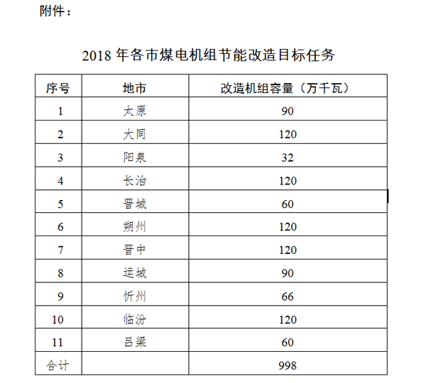 近日,山西省印發了《2018年各市燃煤機組節能改造目標任務》。具體任務如下: