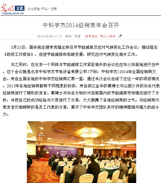與之同時(shí),在北京一個(gè)同樣與節(jié)能減排工作緊密相關(guān)的會(huì)議也在如火如荼地進(jìn)行當(dāng)中。這個(gè)會(huì)議就是北京中科宇杰節(jié)電設(shè)備有限公司(下稱:中科宇 杰)2014年全國(guó)經(jīng)銷商大會(huì)。來(lái)自全國(guó)各地的中科宇杰經(jīng)銷商匯聚一堂,通過本次會(huì)議總結(jié)了過往一年的項(xiàng)目情況。2013年各地經(jīng)銷商都有不同程度的收 獲,來(lái)自浙江金華的黃博士與山西介休的孫總代表經(jīng)銷商進(jìn)行了精彩的發(fā)言。黃博士與孫總分別針對(duì)目前國(guó)內(nèi)的節(jié)能減排市場(chǎng)情況進(jìn)行了分析,并把自己的成功經(jīng)驗(yàn) 與大家進(jìn)行了分享,大大鼓舞了各地經(jīng)銷商的士氣。與經(jīng)銷商代表發(fā)言交相輝映的是員工代表的分享,展示了中科宇杰團(tuán)隊(duì)良好的精神面貌與強(qiáng)大的戰(zhàn)斗力。