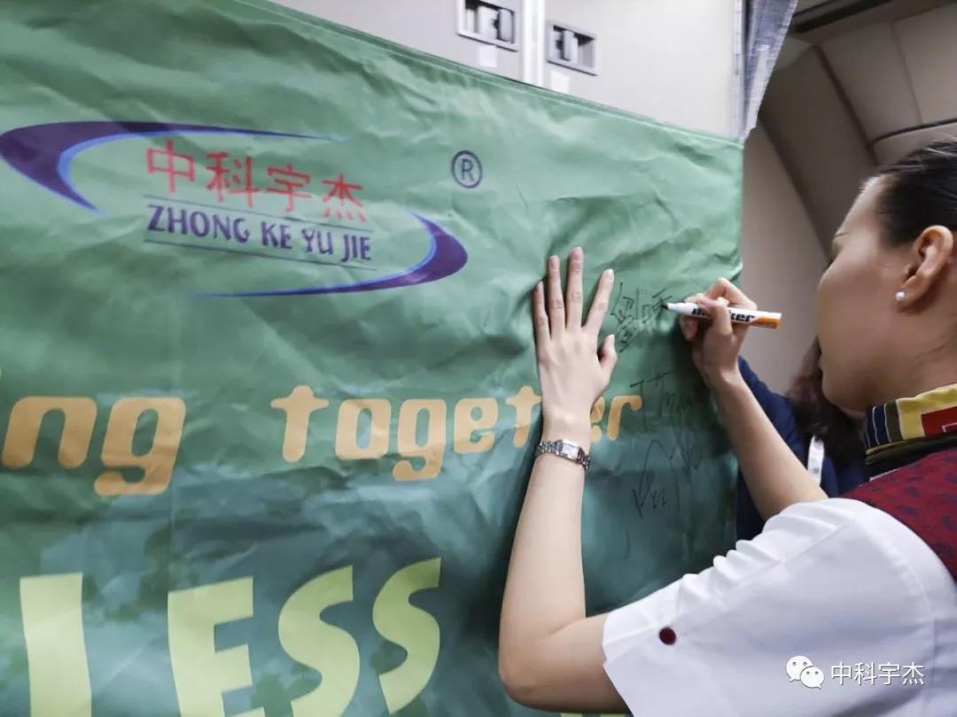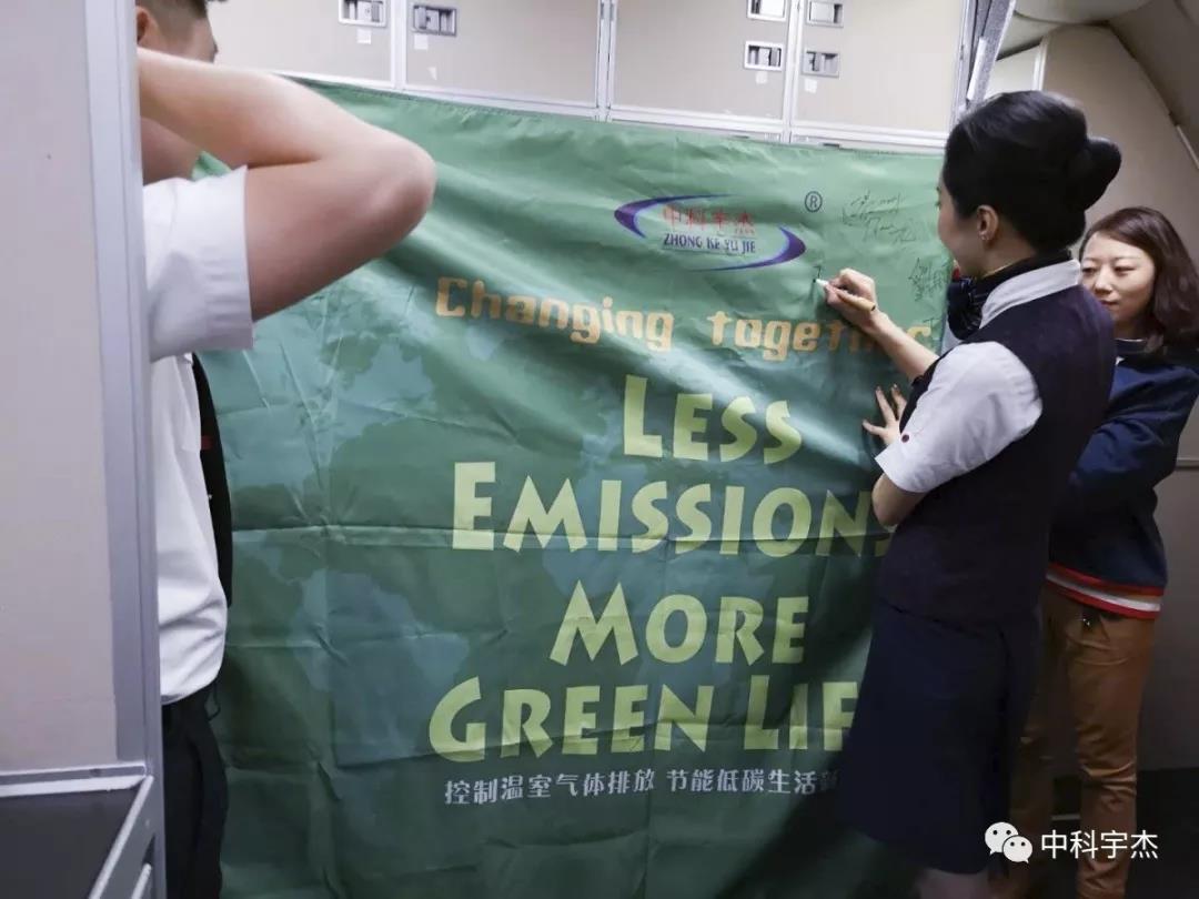 本次公益宣傳愛心傳遞活動得到國航CA877機組成員大力支持,據乘務長介紹國航一直注重綠色低碳,國航機組成員作為節能減排的倡導者,保護環境,人人有責,通過參與中科宇杰本次活動,呼吁全球共同參與,傳遞正能量,積極參與的溫室氣體減排行動。“Less Emissions More Green Life”活動,并在的綠色宣傳旗上簽字,節能低碳我先行,共同參與,共同倡導,節能低碳生活新風尚。
